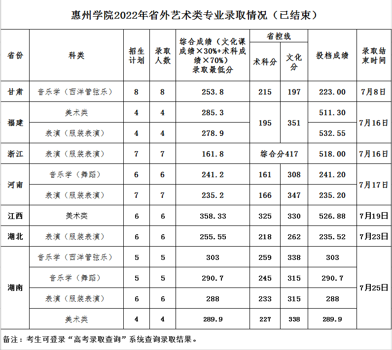 惠州学院2022年省外艺术类专业录取结果公布(已结束)